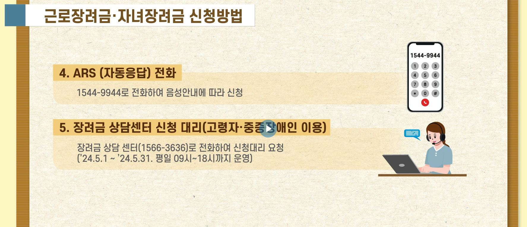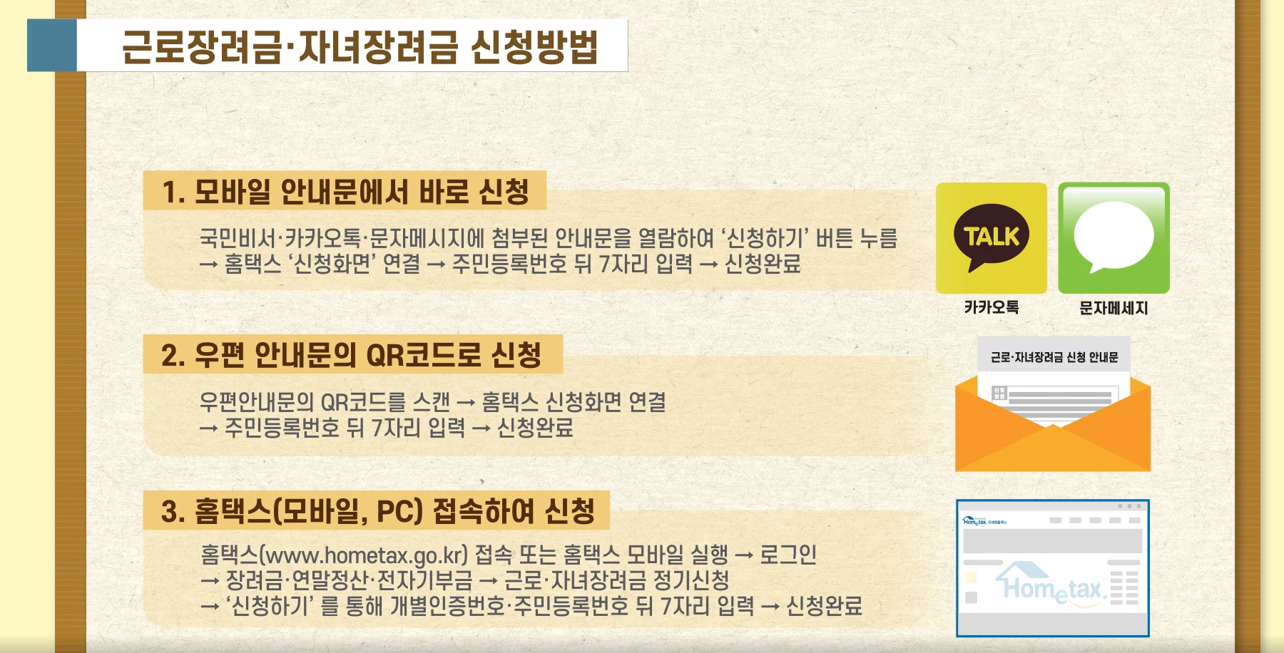 평일 9시 ~ 18시 안내대상자가 동의하면 신청기간 운영되는 장려금 상담센터(1566-3636) 상담사나 세무서 직원이 신청대리 |